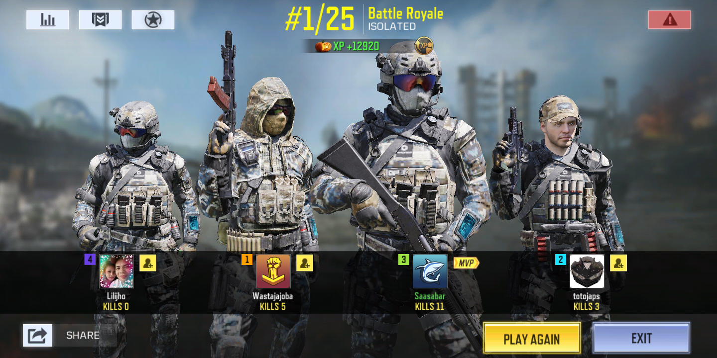 Hey there, thanks for your suggestion! This challenge is now official and can be found here: https://www.glitch.win/index.php?threads/cod-mobile-challenge-last-squad-standing.1560/ 2 Glitch Credits have been added to your account.
